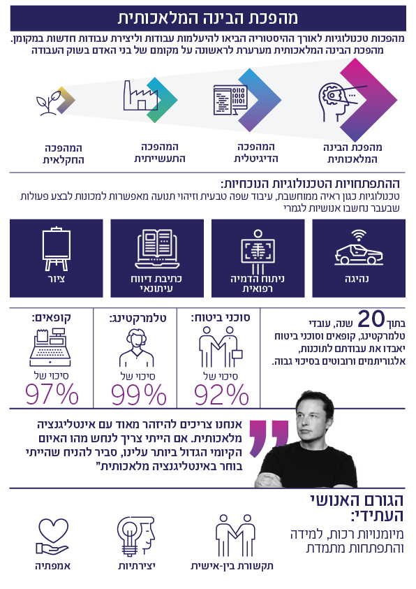 מהפכת הבינה המלאכותית, הרובוטיקה והמכונות הלומדות מאיימת להוציא את האדם מהמשוואה כמרכיב הכרחי ומרכזי בשוק העבודה. אילו מקצועות נמצאים בסכנת הכחדה, ולמה תכונות כמו יצירתיות וחמלה יהפכו את העובדים למבוקשים יותר?