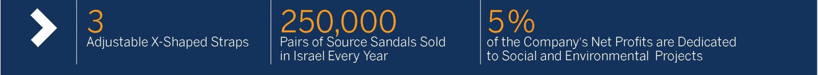 One out of ten Israelis wears Source Sandals, with millions of pairs sold in travel gear stores in 45 countries across the globe, from Australia to China. Company revenues from the sandals are valued at tens of millions of shekels a year. The company also manufactures hydration systems using exclusive technology, generating global success among travelers, athletes and soldiers alike.